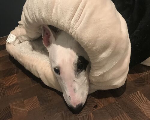 うちにきて1502日目 ~ピィ子の成長日記|124~ 撮影&文|高栖匡躬 ピィ子はブルテリア。短毛種です。だから、寒さにはとても弱いのです……