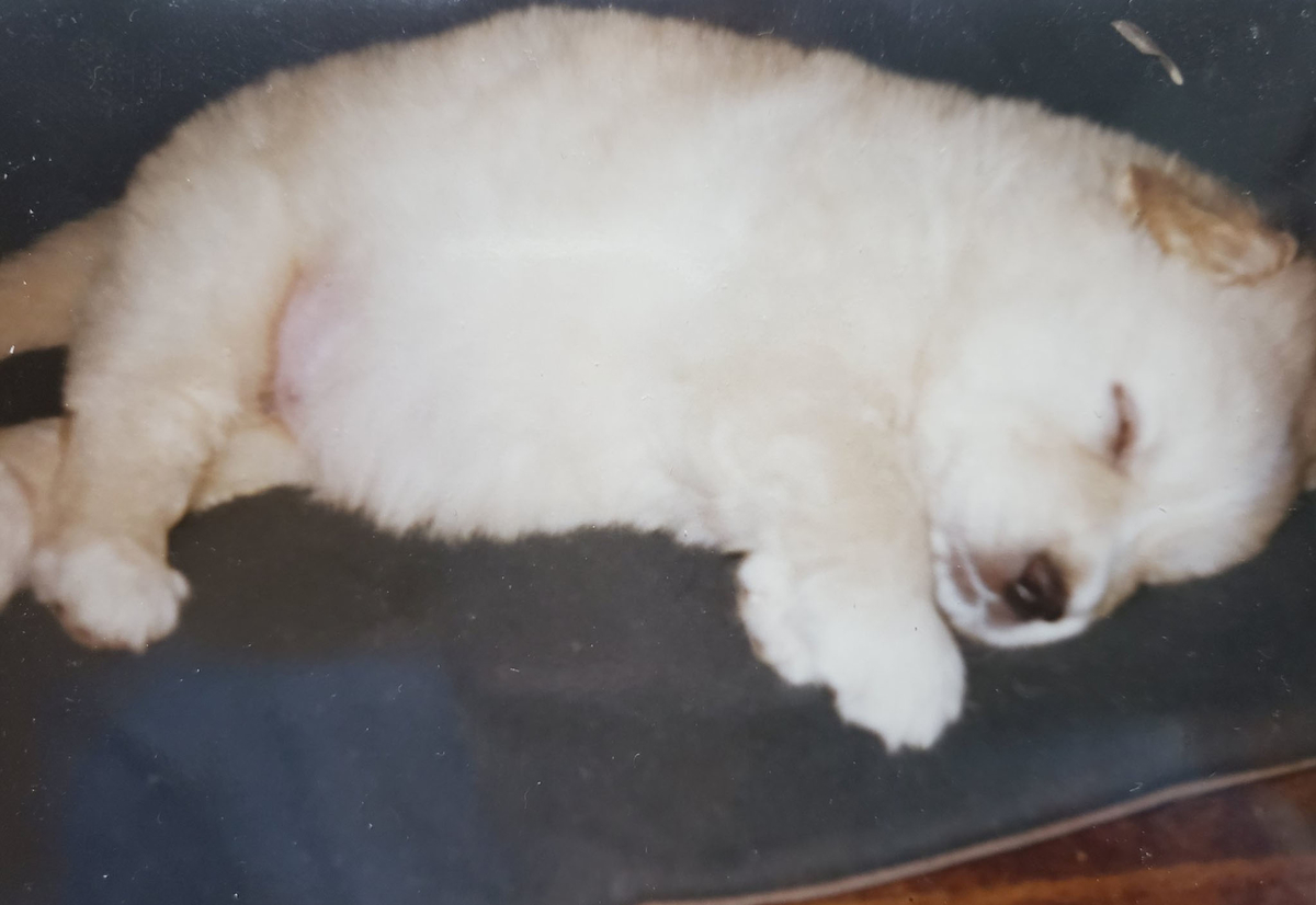 私が学校から帰ると、金色の綿毛みたいな子犬が台所の母の足下にいました。