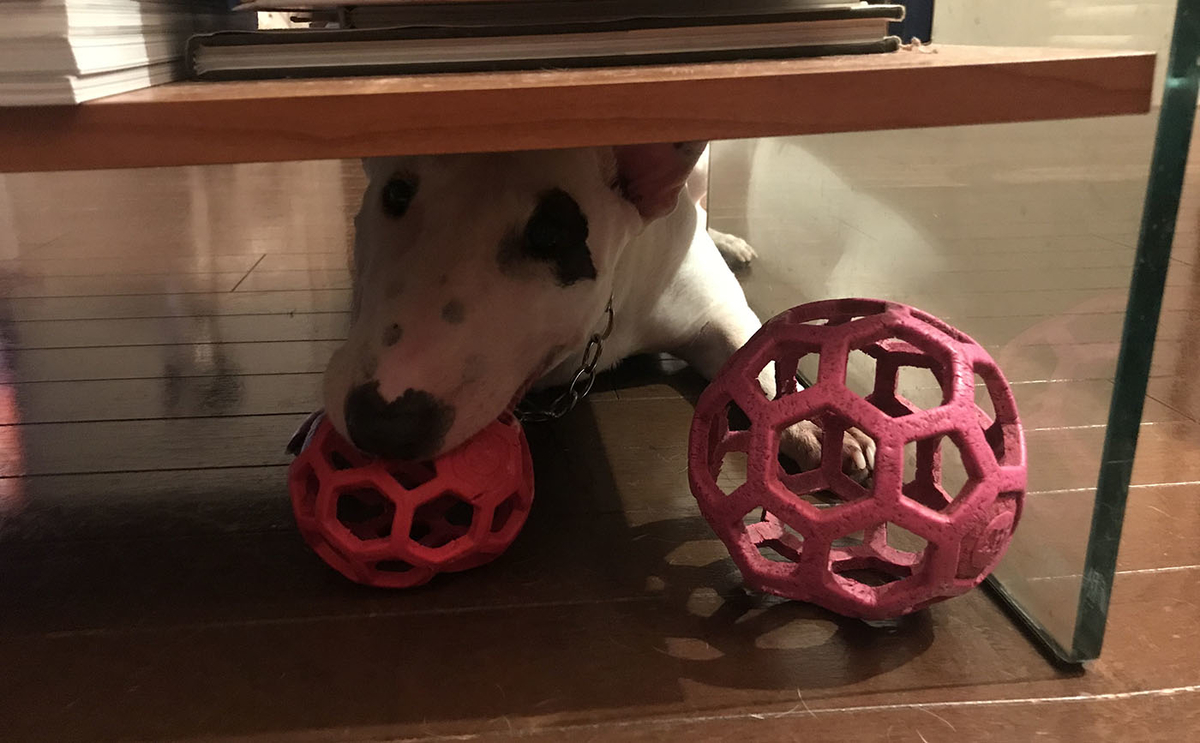 ピィ子の誕生プレゼントはボールにしました。これまでのボールは、丈夫だったけど、ピィ子の顎力には勝てず、ボロボロになっていたので。
