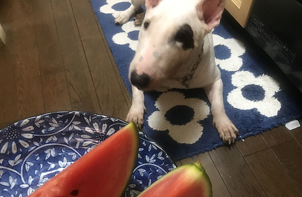 甘いかな?#犬を飼うということ#ピィ子#ブルテリア #黒いスイカ#今夜のお楽しみ pic.twitter.com/NjMDqpZ8Mz